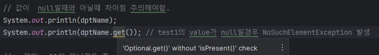 즉 Null 가능성이 있으니 isPresent 등을 사용하여 Null Check를 하라는 말이다.(컴파일 에러는 아니다.)